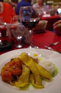 There are multiple dining rooms within the house. We were led up a flight of stairs along walls covered by old pictures of Havana. We turned left, walked through a door and down another set of stairs to a quaint, lovely room with 5 tables, elegantly set up with red linens and white dishes. The length of the back wall was filled by a brown wine rack and the front wall contained a small bar. Once seated, I evaluated the menu, which contained 6-8 dishes. I sadly noticed it did not contain any vegetarian options. However, to my delight, I was informed there was a veggie dish available of Ratatouille. The meal was served with bread and an incredible squash/pumpkin soup cooked with spices. The Ratatouille was comprised of bean curd, veggies, rice, fried plantain and some delicious sauces. This was the most expensive restaurant I dined at in Cuba, with meals ranging from 16-20 CUC. However, there are no words to describe how delicious this meal was! And the feedback I heard from my group about their meals, paralleled my experience. They had a good selections of wine and a trio performing live Cuban music, creating a fun, intimate atmosphere.
