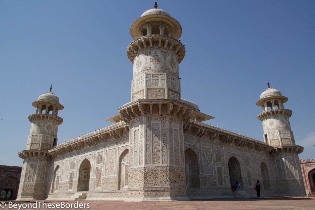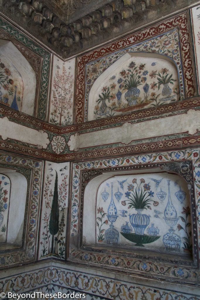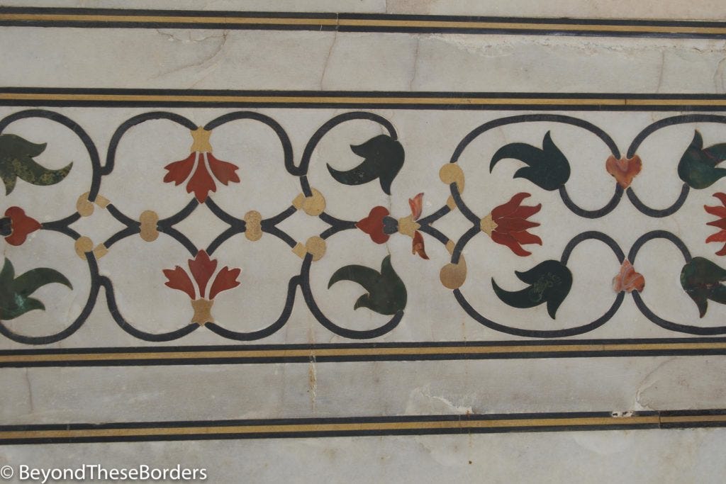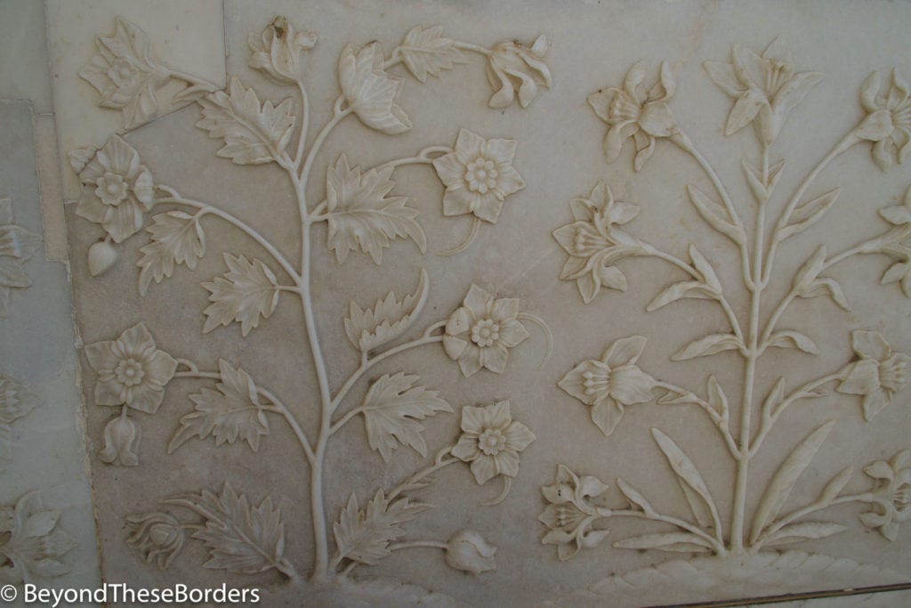 Final stop of the afternoon was the Itimad Ud Daulah Tomb, referred to as the “Baby Taj”. This tomb has not been as thoroughly restored, but like the later constructed and similar style Taj Mahal, also had artwork of cut gems.