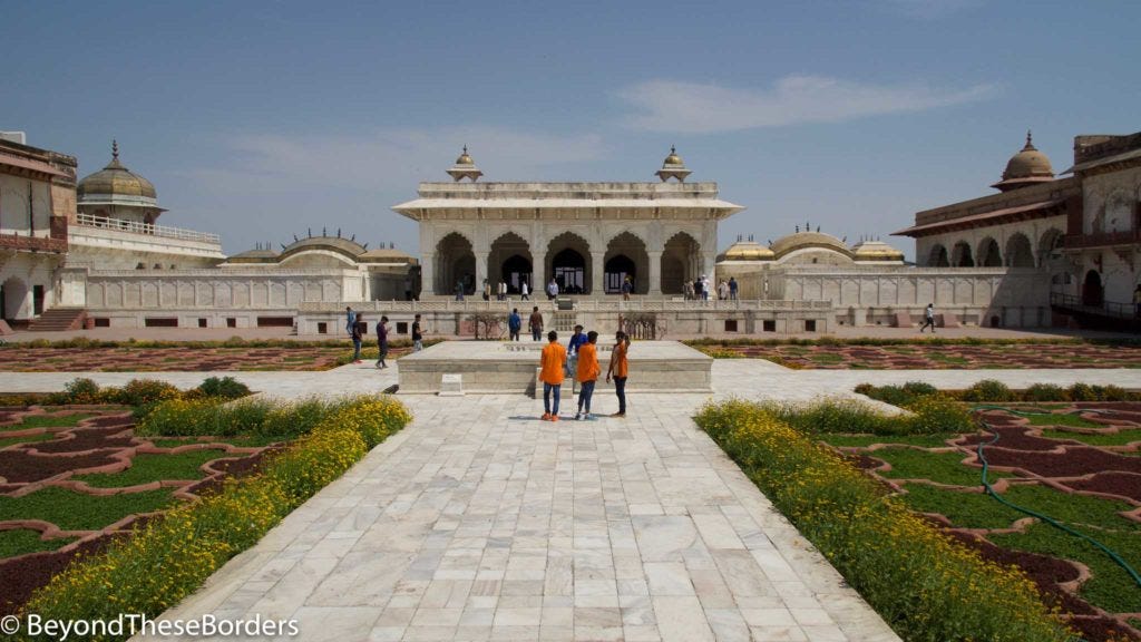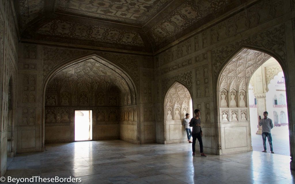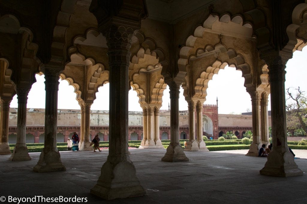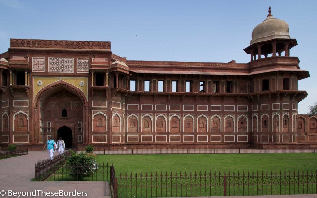 Decorated with our Holi colors, we headed off to visit the Agra Fort. The Agra Fort is a dark red color, made of red sandstone. The fort is filled with courtyards and mosques. It was once the main residence of the Mughal dynasty. Shah Jahan, who built the Taj Mahal, was held captive within its walls by his son at the end of his life. The cell he was imprisoned in provided him a view of the Taj Mahal across the river.
