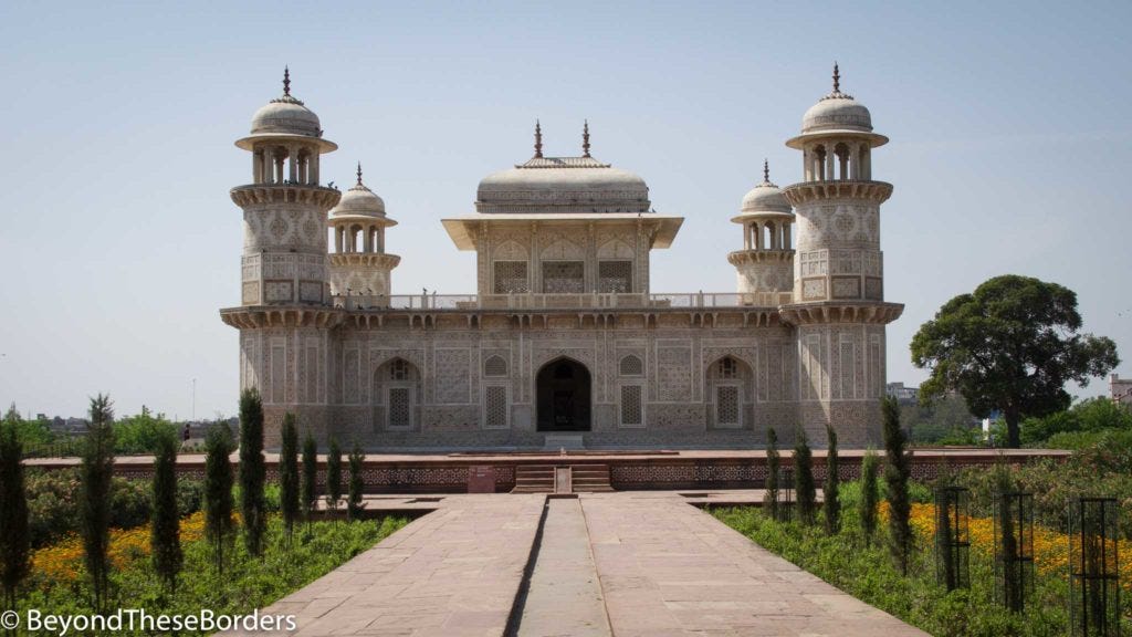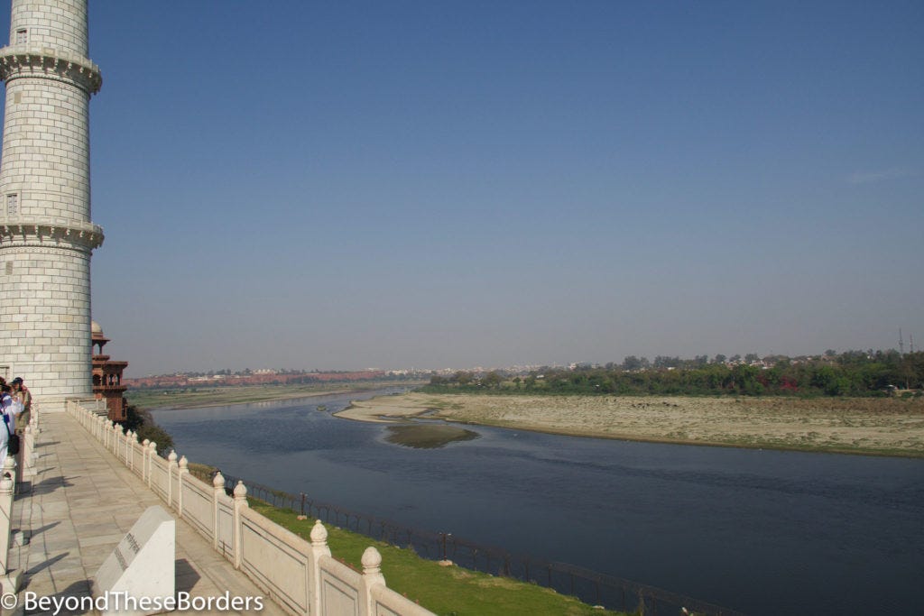 While most tombs are constructed in the center of the courtyard, the Taj Mahal is unique. It sits at the far end, close to the river.