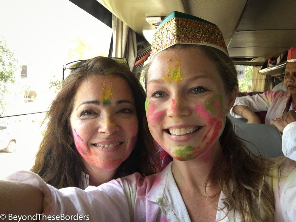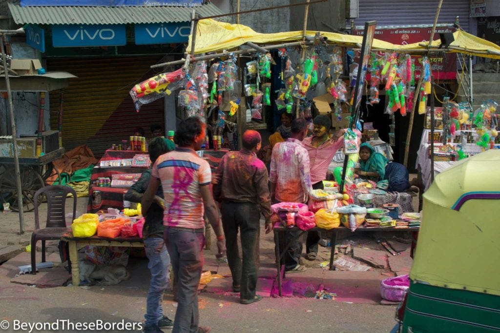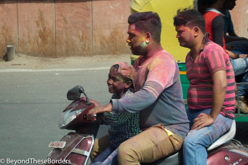 As we drove along the streets, over 95% of the people we saw were covered in a rainbow of colors. We saw young boys smearing each other’s faces and hair with handfuls of yellow, blue, green, and red.