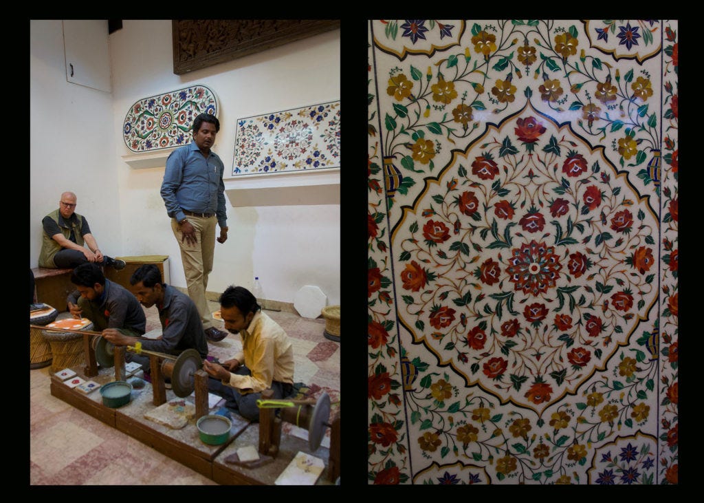 We returned to the hotel for showers and clean clothes. Then in the early evening we visited a marble in-lay company. They showed the traditional ways of cutting, sculpting, and placing gems into marble. We saw marble tables, vases, and artwork for sale. They aren’t cheap, but were beautiful. One dining room table was selling for $11,000 USD.