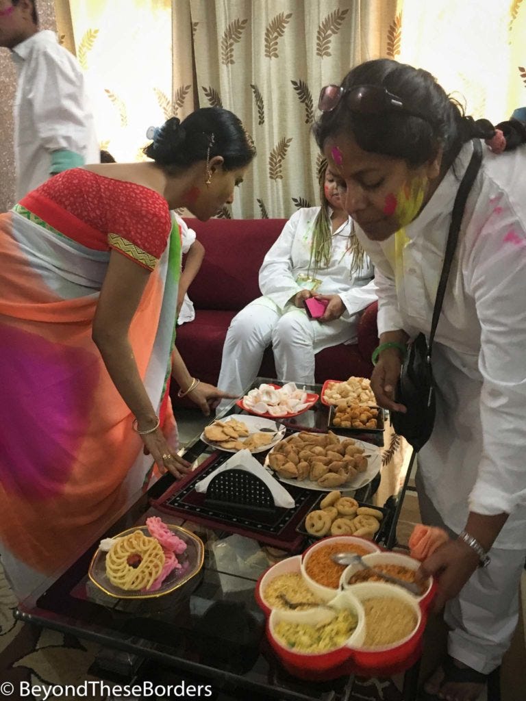 We arrived to the family’s house, and were greeted at the door by having a small amount of color smeared on our foreheads, then checks, noses, etc whole flower pedals fell from above us. Inside their home, we continued to smear color on each other, made introductions, then were served drinks and food. They had a buffet of Indian snacks set out on the table for us to try.