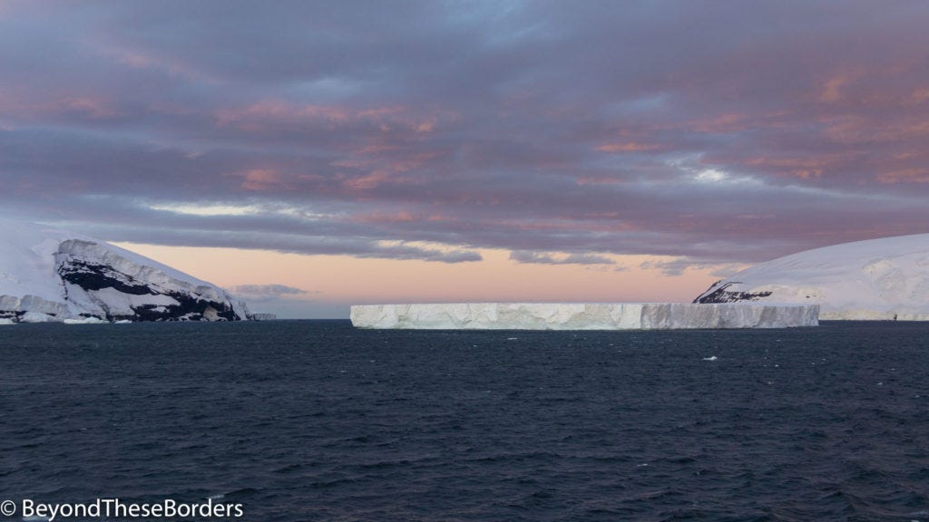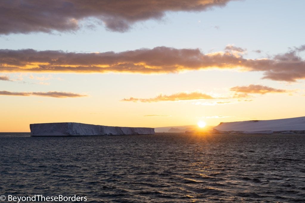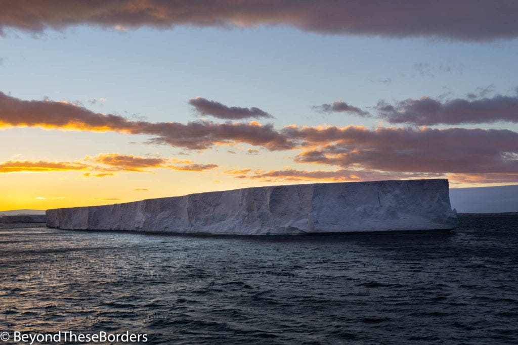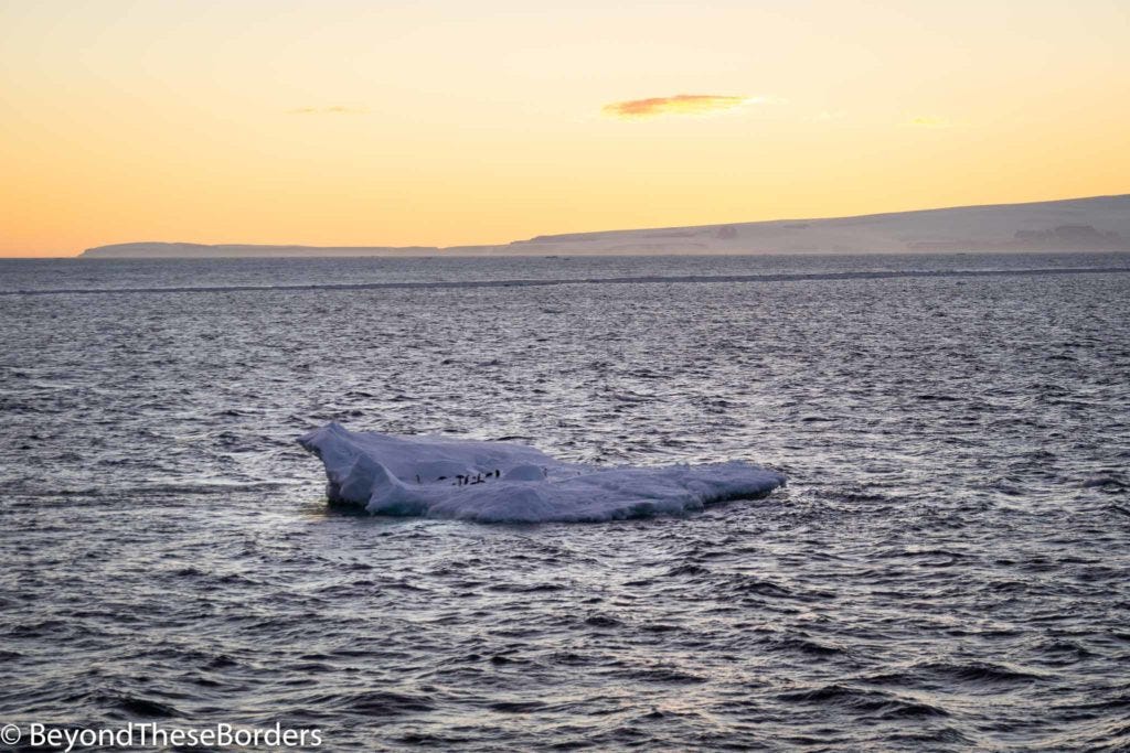 That night I watched the sunset as we cruised past huge tabular icebergs and saw penguins catching a ride on some small icebergs.