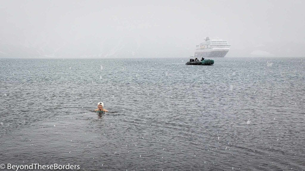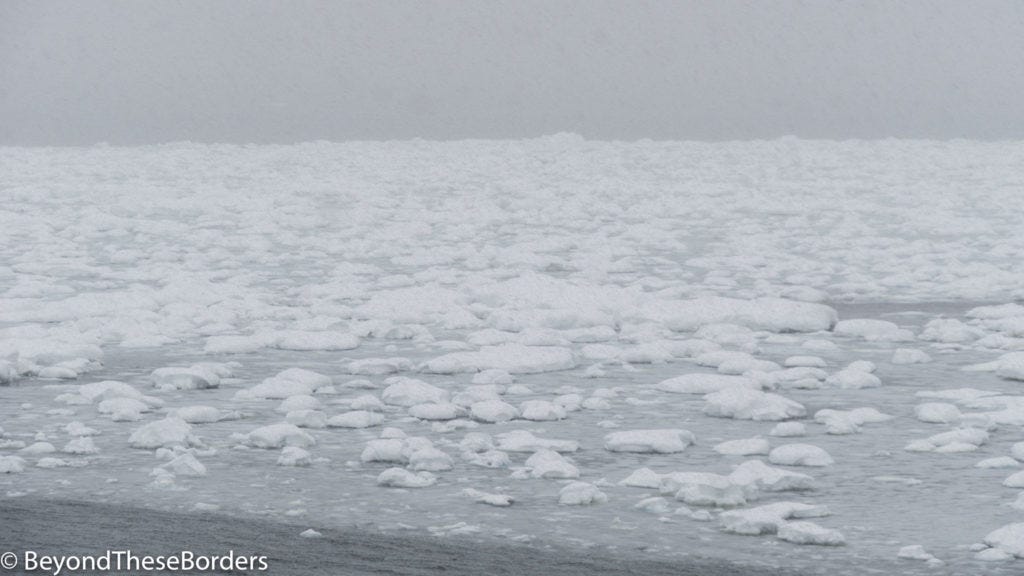 Once on board the Midnatsol, we had breakfast with mimosas and the ship headed south. The plan had been to land and kayak near Port Lockroy. Ice blocked every channel the captain tried for and we just watched snow fall over ice covered water all day.