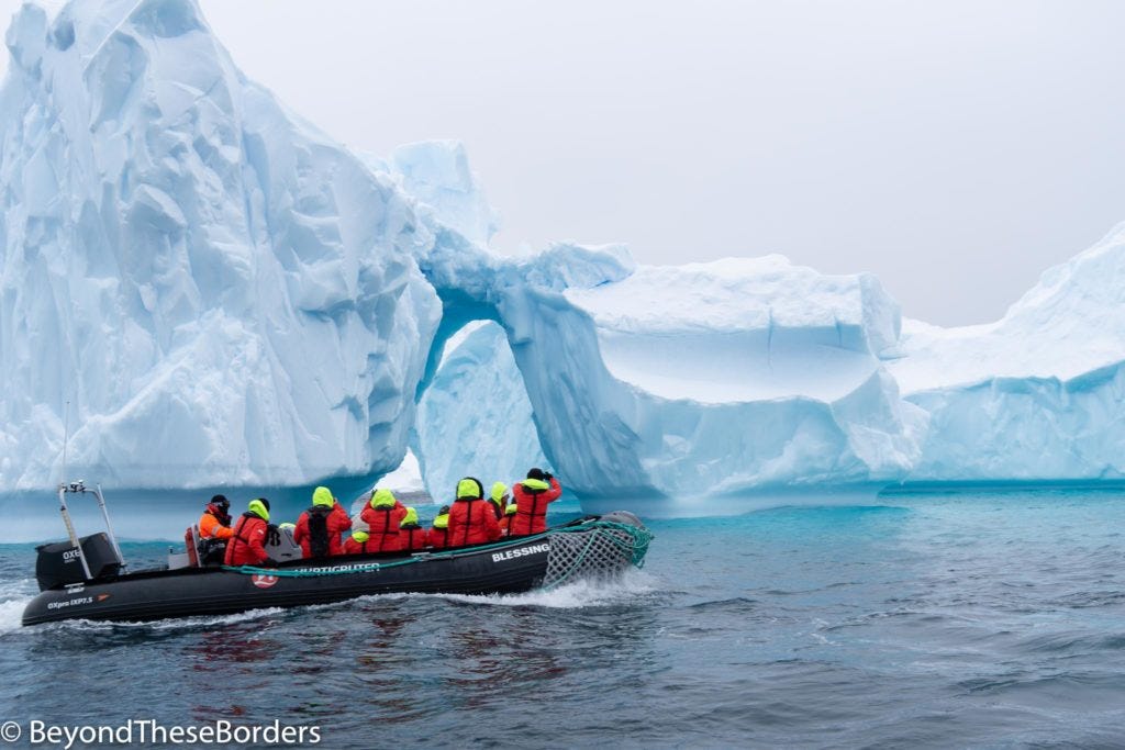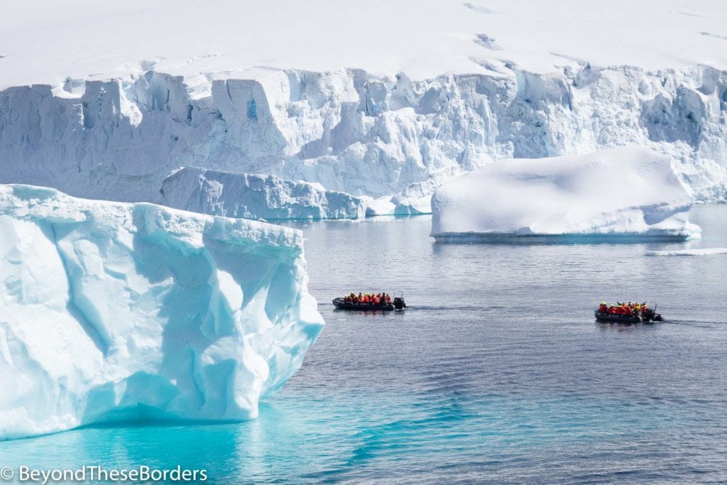 As soon as we were back on the ship it was time for a cruising expedition. On zodiac boats, we circled the huge, enchanting icebergs of various designs and shades of blue inhabiting the bay.