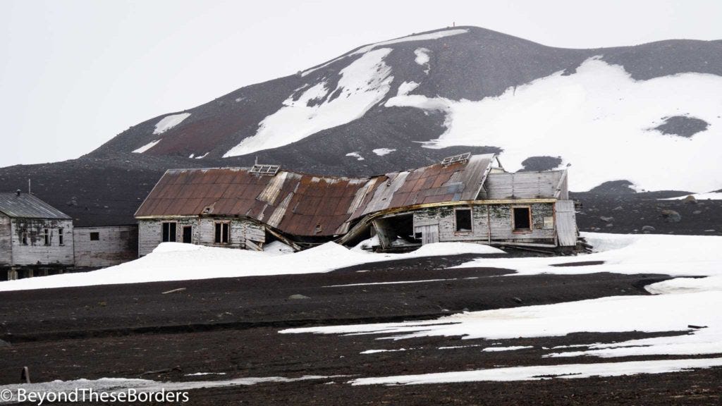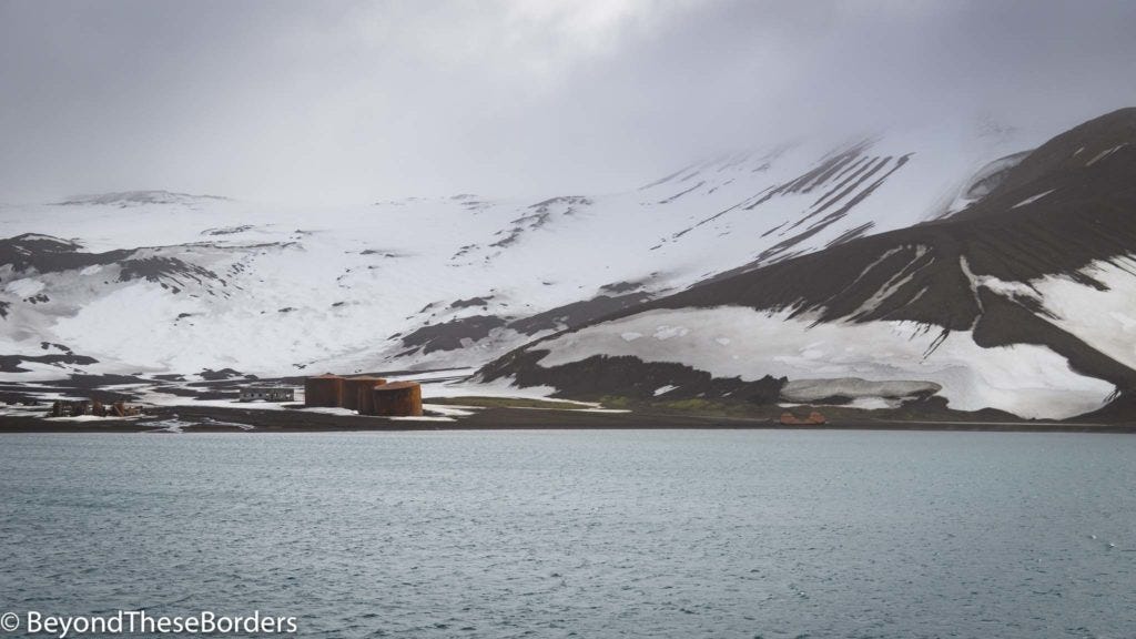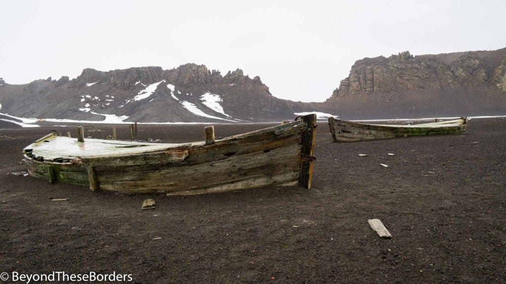 Deception Island is actually an active volcano. We entered the caldera… which is the collapsed middle of the volcano. Now smaller volcanoes rise from the sides. The last times these volcanoes erupted were in 1968/1969 when whaling camps were still located here. A few buildings and machines remain as ruins on the island to remind us of its past.