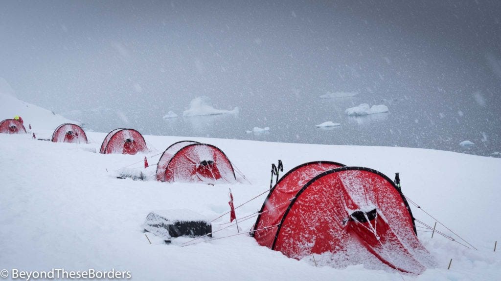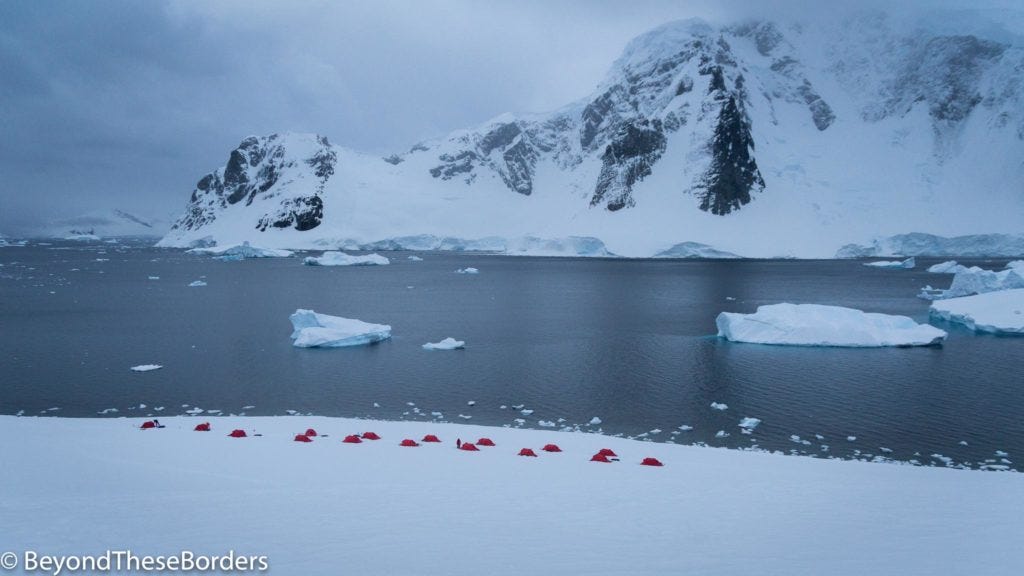 Back on board, another great dinner buffet was served. Then I packed up my things for a sleepover on the snow. A few lucky passengers were able to add on camping in Antarctica. At 10 pm we cruised back to the land and dragged our equipment through the snow where we set up our red tents. Then the expedition team gave us a fascinating tutorial on the Antarctic porta-potty.