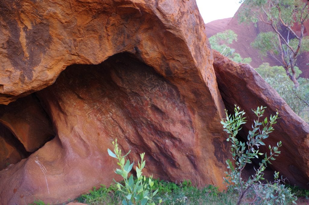 A sunrise viewing lot sits on the other side of this sacred rock from which it should glow in the morning light similar to sunset. Once the sun was up, we drove and wandered around the rest of the park. Hiking trails encircle Ayers Rock and take you close to boulders, caves, and ancient drawings.