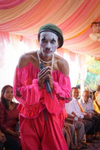 Next up was the most confusing and entertaining ceremony. This tall, skinny man in a bright pink outfit and mime makeup walks out and spoke via a microphone to the crowd. It appears to be some sort of roast… and I believe all us Americans, sweating in the humid heat are the punchline for a good bit of it. He speaks only in Khmer.. so none of us have any idea what is being said. But it appears to be quite funny, as all the Khmer guests are laughing heartily. A young woman joins him and they asked one bridesmaid and one groomsmen a few questions. Then another man and woman try to teach them some Cambodian dancing. (The entire wedding party is American, only the bride is originally from Cambodia at this wedding).