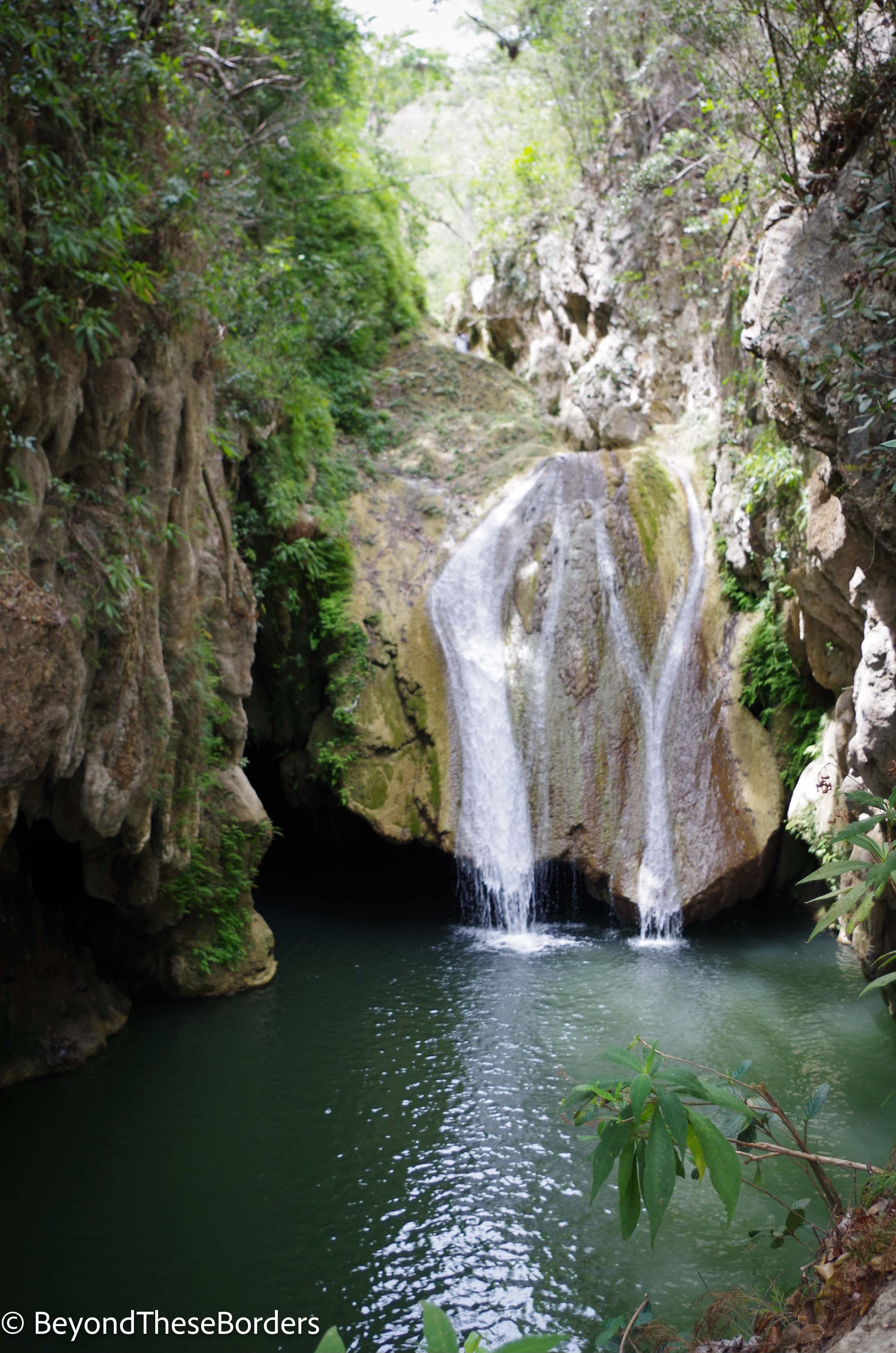 Once in the water, I realized how incredible this place was. The best part was swimming into the cave behind the waterfall. Inside, the icicle shaped stalactites drip water all around you and bats fly in and out of the dim light towards the top of the cave. This may sound unnerving, but the cave ceiling was high and the bats were distant enough to not feel like any sort of threat. The dripping water and bats created an unreal, mystical sense. Along the left entrance of the cave, rock formations are available to rest upon. We spent an hour or two swimming, then found a comfortable place along the cliff to relax to the peaceful sound of cascading water.
