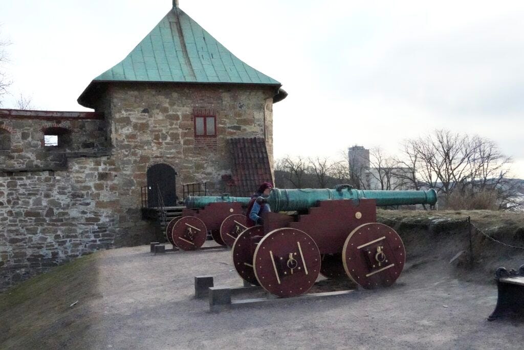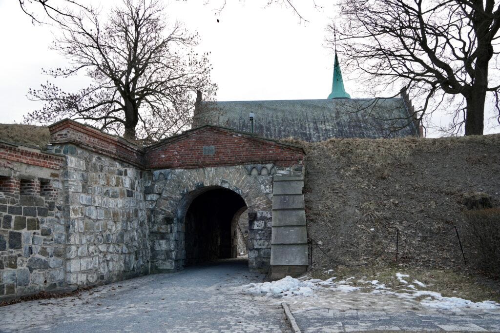 Walking around the grounds of Akerhus Fortress is free to the public. You can stand on top of the walls of the fortress and look out over the Oslo Fjord and the city. Walking under stone archways, you will see the castle walls and old cannons set up along the edges of the fortress. You can also visit the inside of the castle, but you will need a ticket to access this area. Unfortunately the castle wasn’t open the day we visited the site. Check the castle hours as well as the fortress hours before planning your visit.