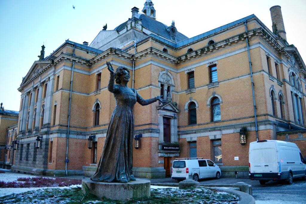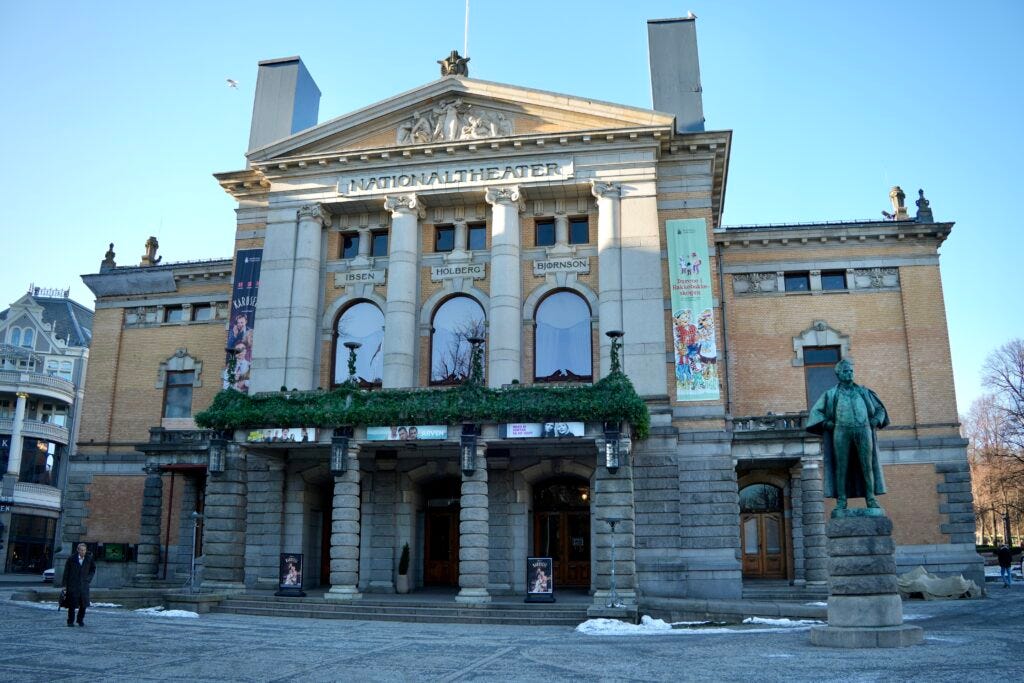 The National Theatre was inaugurated in 1899. Statues of two famous Norwegian writers, Henrik Ibsen and Bjørnstjerne Bjørnson, stand in front of the theatre. Other Norwegian artists statues are scattered around the grounds, included actress Wenche Ross (pictured below) who made her stage debut in 1935.