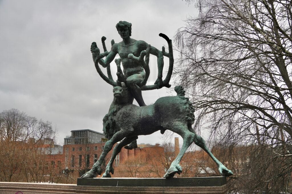 Anker Bridge is also known as the Fairytale Bridge. Four bronze sculptures depicting well-known Norwegian fairytales sit on each corner of the bridge. The four characters are the following: White Bear King Valemon who is cursed to spend his days as a polar bear after refusing to marry a witch. Per Gynt who is a deer hunter that rescues three dairy-maids from trolls. Katie Woodencloak who escaped her evil stepmother on the back of a blue ox. Veslefrik med felt who is a young man with a fiddle that gets three wishes from a troll. The Anker Bridge crosses the Ankerselva River and connects the city center to the trendy neighborhood of Grünerløkka.