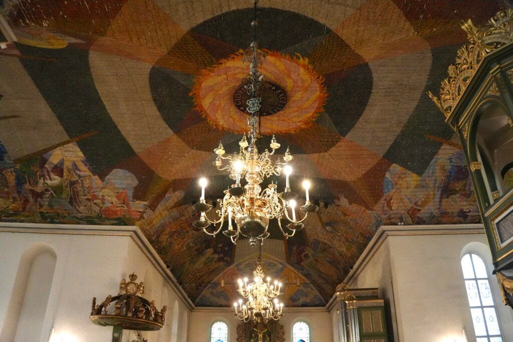 Oslo Cathedral is located in the city center. It is the seat of the Bishop of Oslo and has held royal weddings since the nation gained independence in 1905. The cathedral was originally named Church of Our Saviors and was built in 1697. A beautiful mural is painted across the ceiling inside the church. It was created between 1937-1950 during the last major renovation of the church. A fiery sun glows in the center with the inscription “Gloria in excelsis Deo” – “Glory to God in the highest.” The north, east, and south naves of the church illustrate Christ and his actions. The west nave shows the four evangelists of the New Testament and four of the prophets from the Old Testament. For a more in depth description of the cathedral, read the articles listed on the official Oslo Cathedral page: www.kirken.no/nb-NO/fellesrad/kirkeneioslo/menigheter/oslo-domkirken/Aktuelt/welcome-to-/photos-from-oslo-cathedral2/