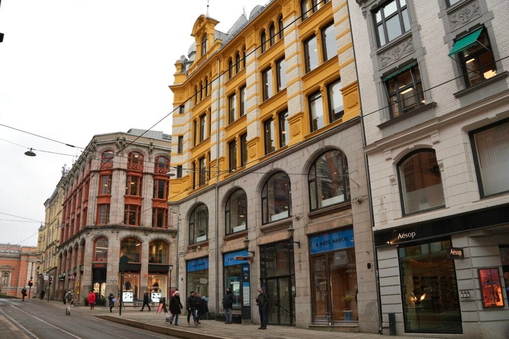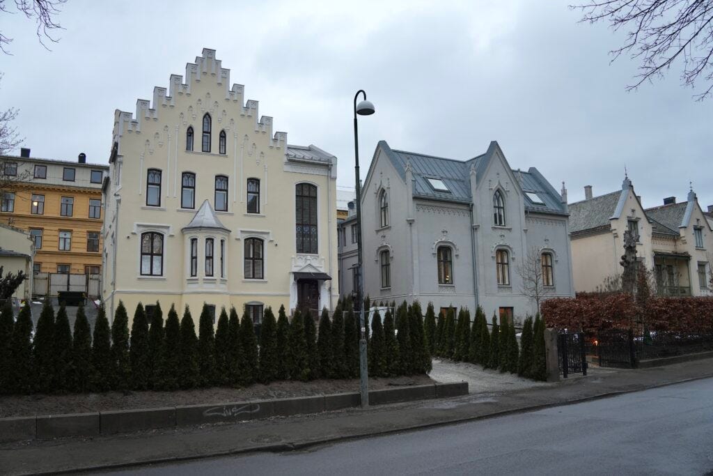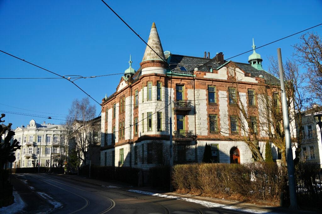 I was surprised and really impressed by so many buildings while walking around Oslo. So many regular apartment buildings were beautiful and interesting. Many of these large, multi-story buildings had turrets and cool facades.