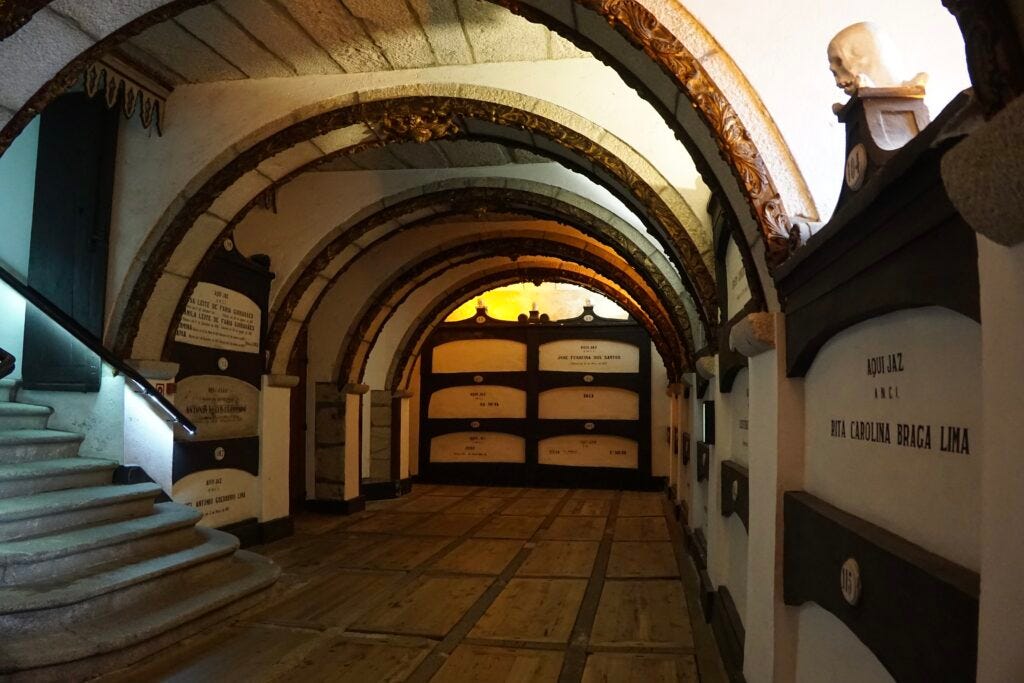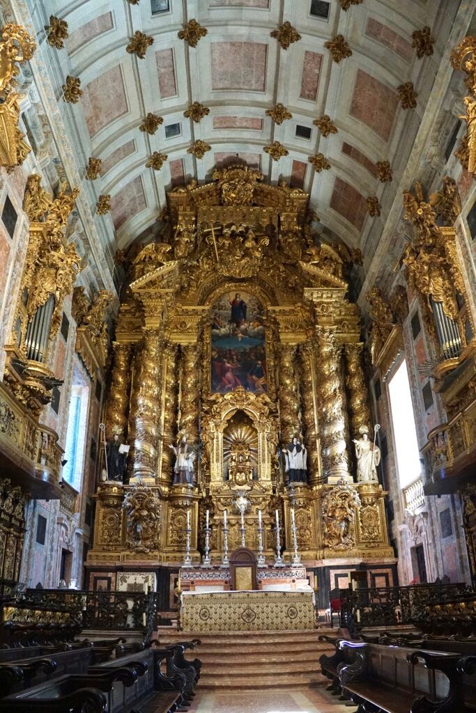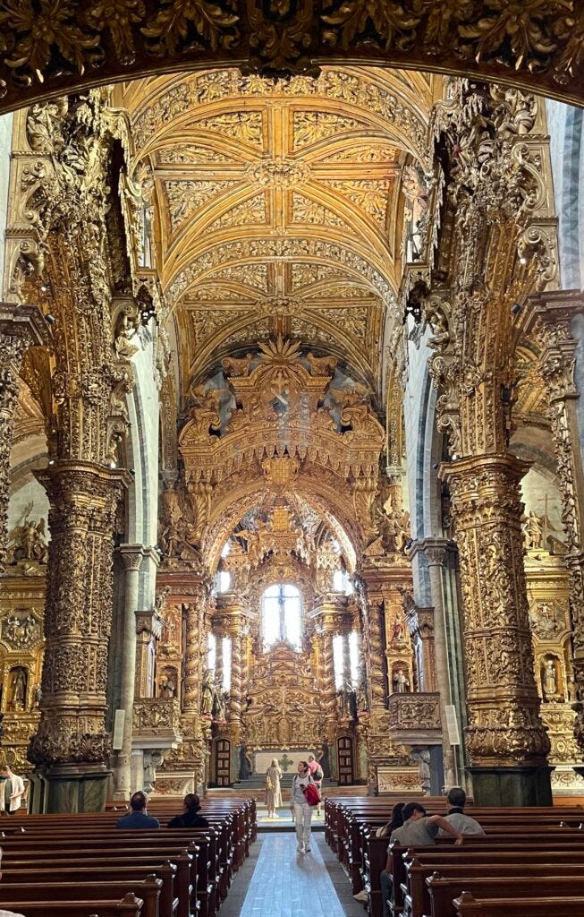 The Church of St Francisco is the most elaborate church we saw in Porto. Practically the entire inside is baroque carved wood covered in dazzling gold leaf. The church was built in the 14th century in a plain gothic style and had elaborate alterations for centuries after. Entrance to the church also gains you entry into the catacombs.
