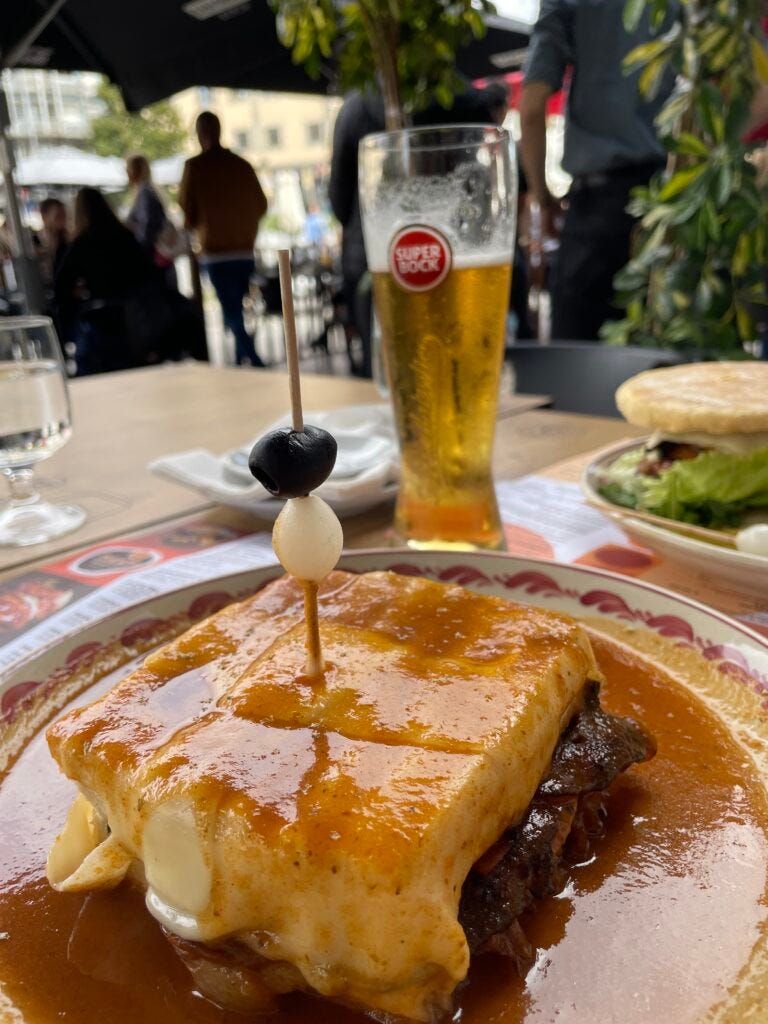 The Francesinha is a Porto special comprised of thick slices of bread with cheese and layers of assorted hot meats like ham and steak. The whole thing is covered in more cheese and a tomato and beer sauce called molho de francesinha and baked in the oven. The vegan version at Santa Francesinha had white bread, grilled tomatoes, portobello mushrooms, grilled onions, seitan steaks, vegan cheese, vegan sausage, soy chorizo, zucchini and vegan sauce. I really enjoyed it.