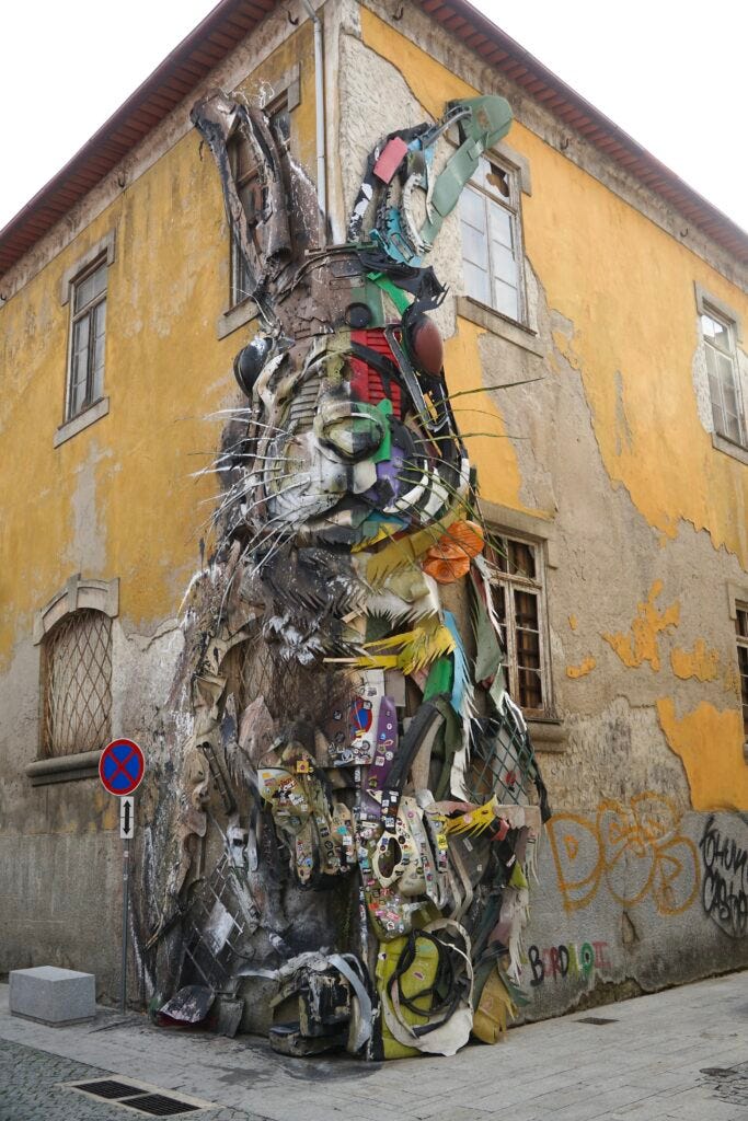 While checking out port cellars in Vila Nova de Gaia, we stumbled upon the “Half Rabbit” sculpture. It is a sculpture made of recycled materials and trash collected in the city, commenting on society’s wastefulness and the consequences for the natural environment.