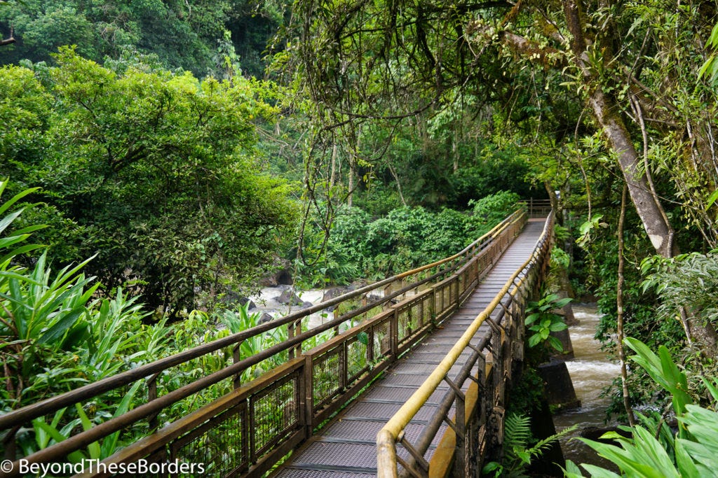 We stayed at a hotel just 1 1/2 blocks from the bus station where we grabbed a $1 bus to Iguacu Nacional Park. It took around 45 minutes. Once there, we purchased tickets and got in a queue for another bus. This one drove for 20 minutes through the forest and we disembarked at the stop with the pink hotel. Down the trail a couple minutes, the first view of Iguazu Falls greets you! The falls are in the distance but already fabulous.