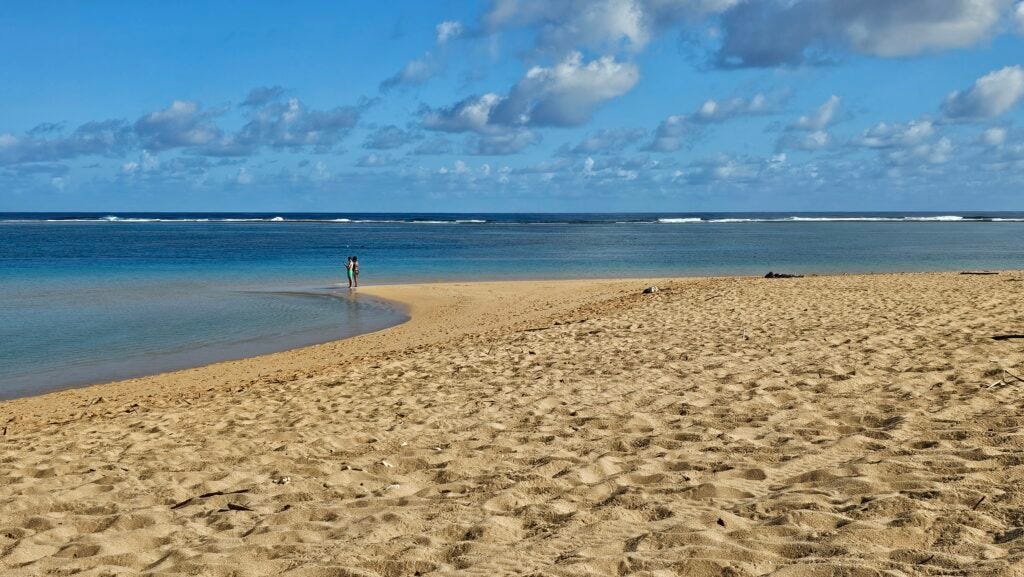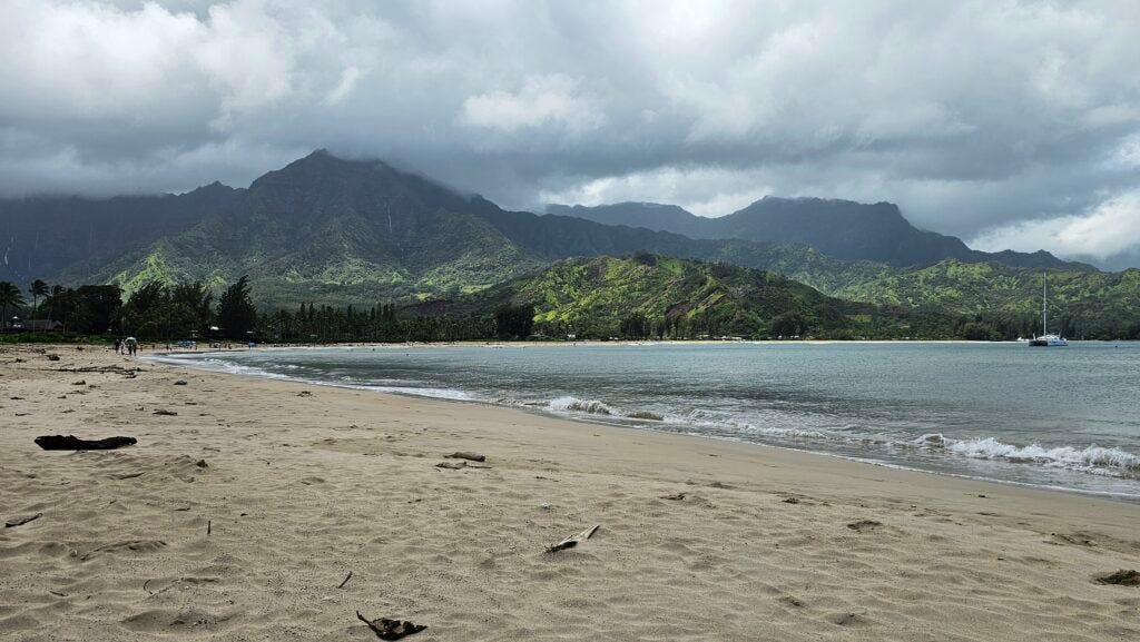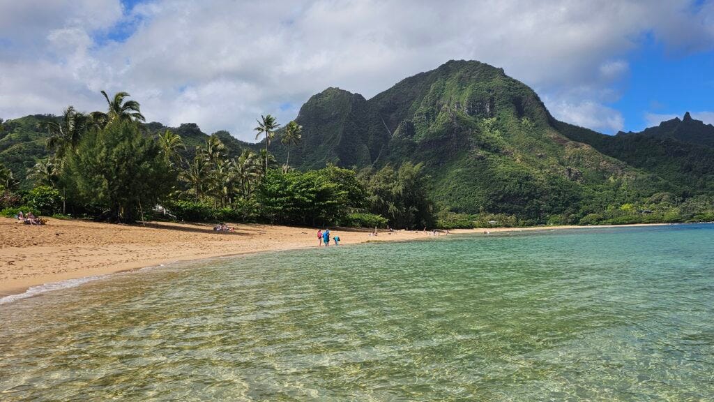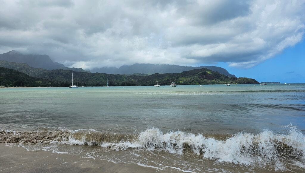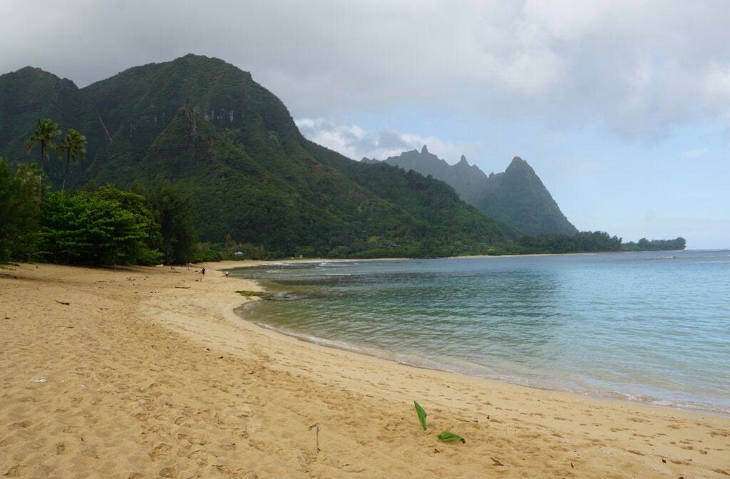 Hanalei bay is a beautiful bay half surrounded by green, waterfall-covered mountains. Moody clouds hovered above, encompassing just the tips of the distant mountains. While the coast was gloomy, the sky over the ocean was clear and blue. Plenty of parking is available in the area, making it an easy beach to visit while still being gorgeous. Bits of driftwood scattered in the sand provide a rustic natural beach. The bay water was refreshing and fairly calm, gently rolling onto the sandy beach.