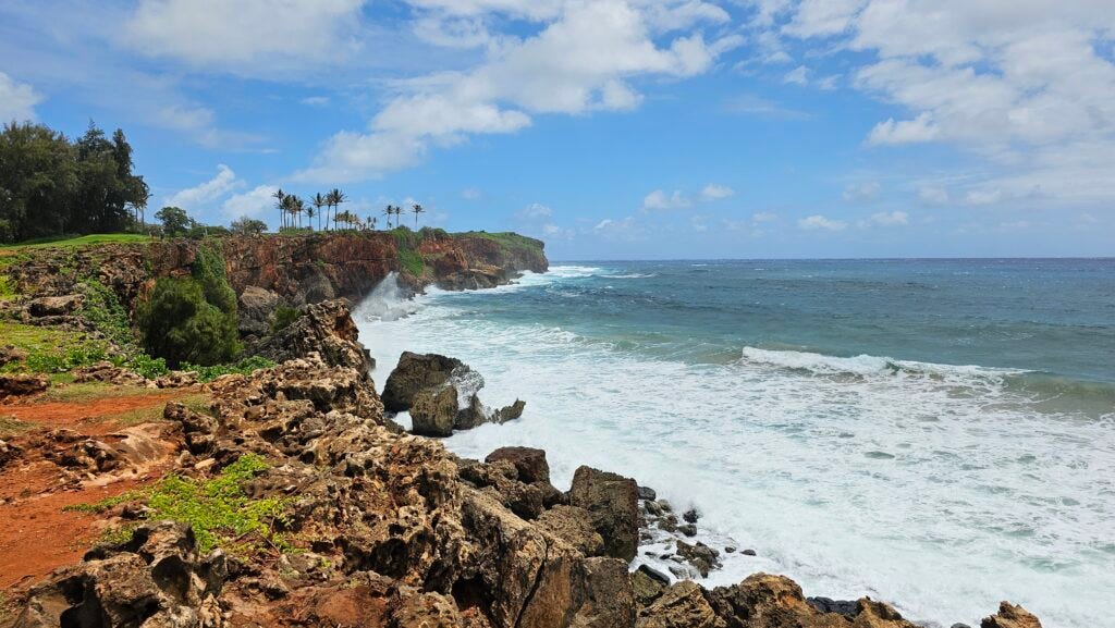 The Heritage Trail is a short, 1 mile each way, out and back hike along the west coast of Kaua’i. It starts at Shipwreck Beach which is small, pretty, and relaxed. The hike has multiple trail options, all leading the same general way with the proximity to the ocean varying slightly. You can hike along these cliffs for dramatic coastal views. Or you can hike in the trees and be shielded from the strong wind. The trail eventually enters a golf course and extends a bit beyond. This hike was a lovely way to break up our drive from Waimea Canyon to the north side of the island.