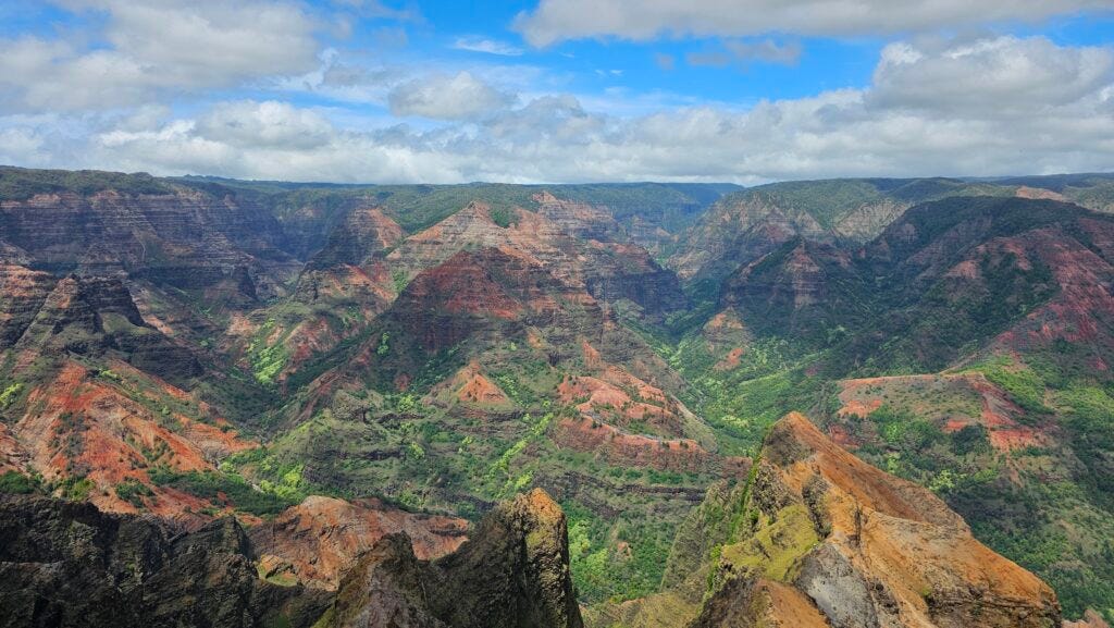 I was blown away by the contrast of intense green, lush valleys next to the orange and red hills of Waimea Canyon. The canyon is about 10 miles long, a mile wide, and 3,000 feet deep. You don’t want to miss Waimea Canyon.