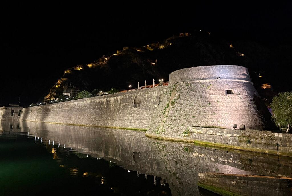 The walls extend far beyond the Old Town, climbing up the mountain behind to a fort perched high above. These grey stone walls mostly blend into the mountain during the day but at night the walls are illuminated an orangish glow snaking up the mountain.