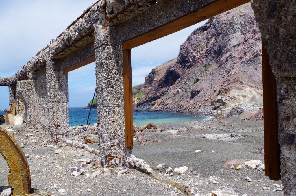 After leaving the main crater, we encountered a couple tiny streams heading out from the center. The first one was very warm, like a hot tub. We tasted the water and it tasted of iron. The second one was fairly cool and was citrus-like flavored. We were told how people tried to mine on this island for years until in 1914 the western crater rim collapsed causing a mudslide that destroyed the mine and village. Only the camp cat survived. There are skeletal remains from some 1920’s mining buildings still standing on the island.