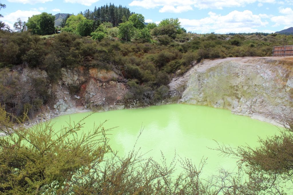 If you only have time to see one geothermic park, I would recommend Wai-O-Tapo over Waimangu Volcanic Valley. There’s a well laid out trail through the park, passing craters with gas steaming up from the rumbling centers, silt terraces, and bubbling mud pools.