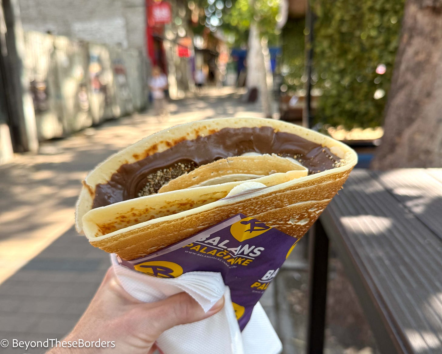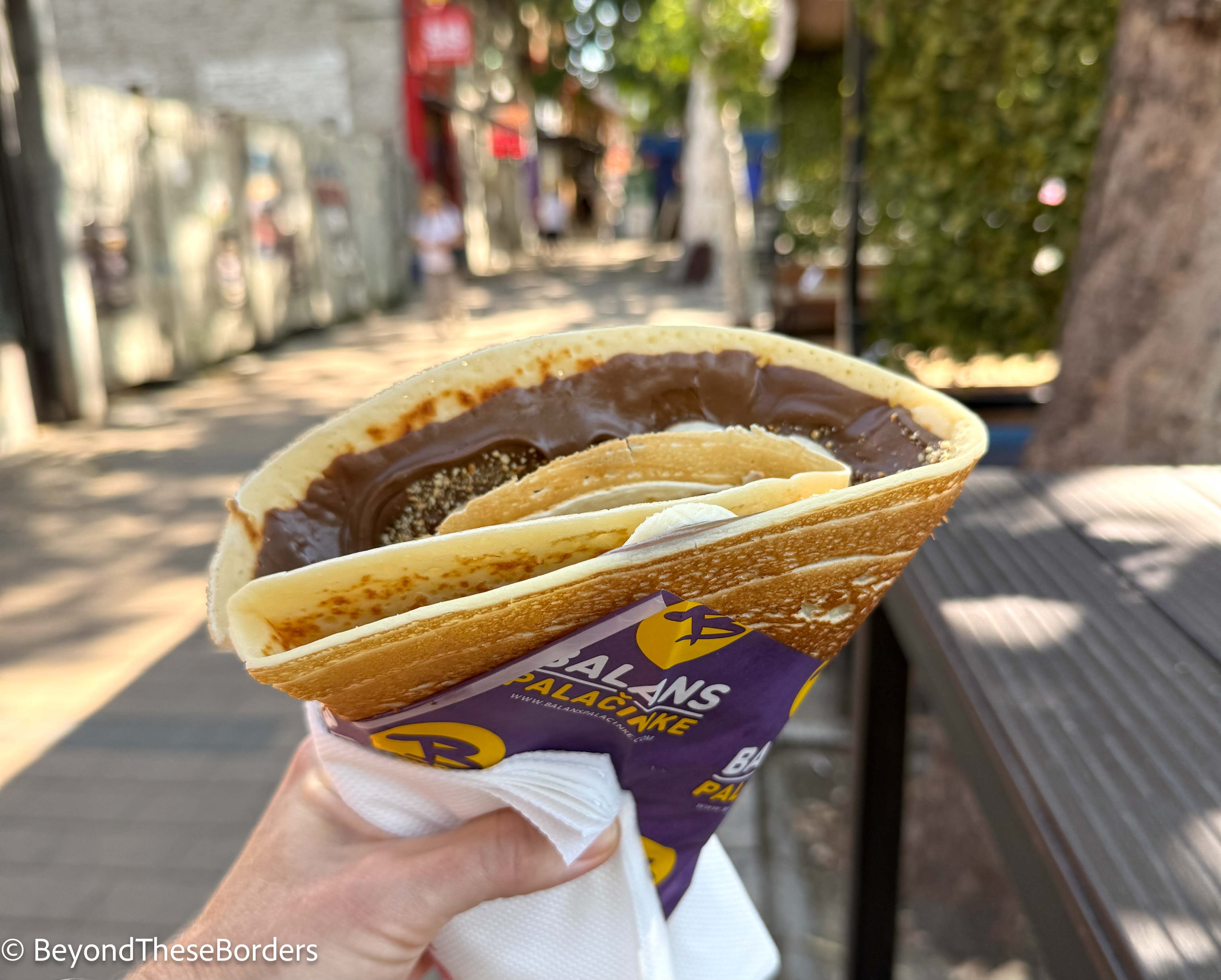 After the market we stopped at a shop to try a local snack called Palačinke. Palačinke is a thin Balkan style crepe that is covered with a sweet or savory filling and folded. It was very sweet, decadent, and delicious. A popular topping to add is “Plazma” which I ordered not knowing what it was. It is a brand of biscuit that they crush up as a topping.