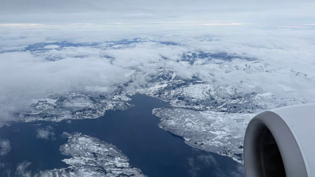 The flight up to Tromsø was short and actually an awesome experience itself. It was just under 2 hours to fly from Oslo to the northern city of Tromsø. As we got close, the views out of the plane window were stunning! Clouds covered parts of the view, but below them the mountains and deep branching fjords spread out below us. Gorgeous!