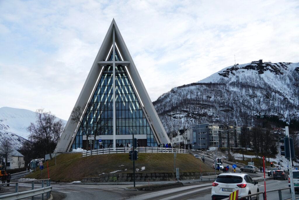 The Arctic Cathedral is another tourist spot. This unique structure is visible from the banks of the fjord. It has a beautiful stain glass mosaic of Christ that covers the entire wall. There is a charge to enter the church and since we were really trying to watch our spending during our trip we chose not to enter. As of 2025 the cost was 80 NOK to enter the church.