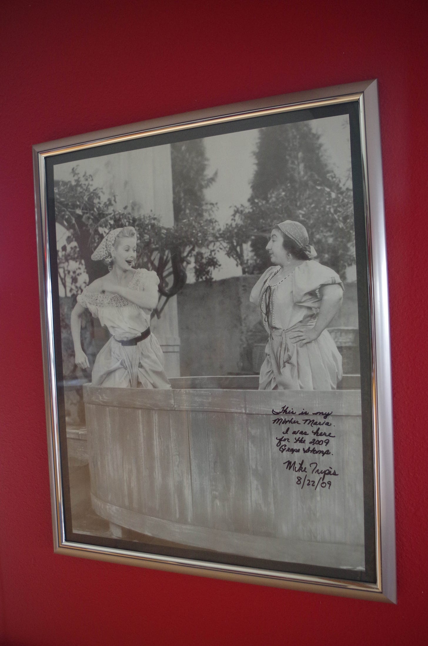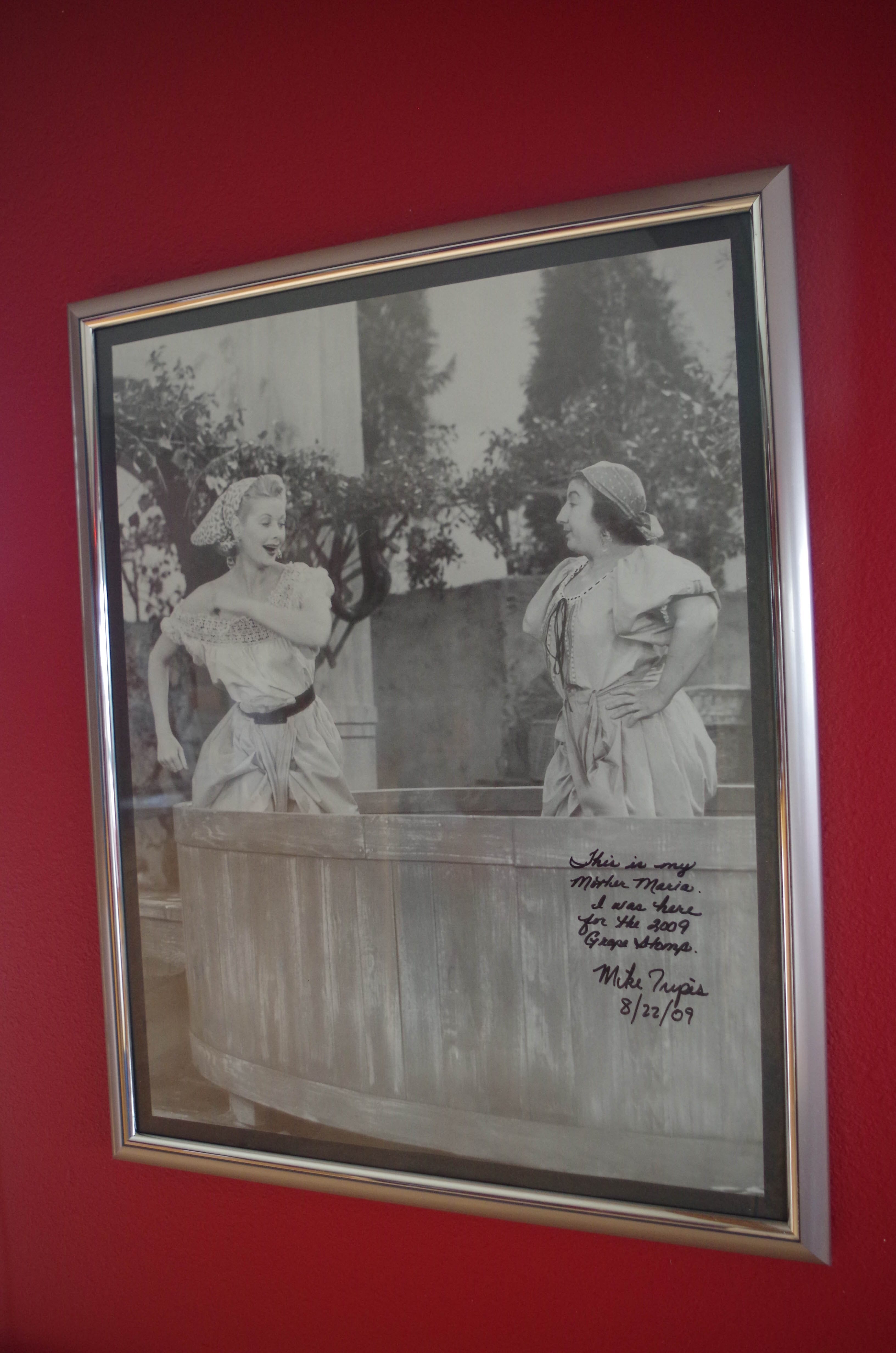 When visiting the tasting room, take note of the picture of the famous “I Love Lucy” grape stomping scene. Years ago, a man from California was at the vineyard and pointed out that the other lady in the scene was his mother. He signed the picture.