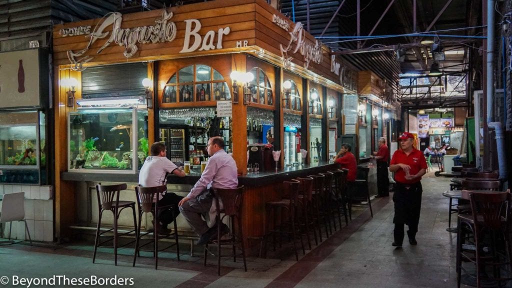 Within a couple blocks of the entrance to the funicular are many bars and restaurants. We found one with a dish called chorrillana. It’s French fries with various ingredients piled on top. Ours had avocado, tomato, and a little cheese. We also ordered a Chilean beer that was delicious and quite strong.