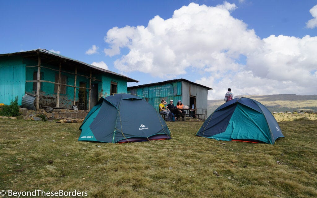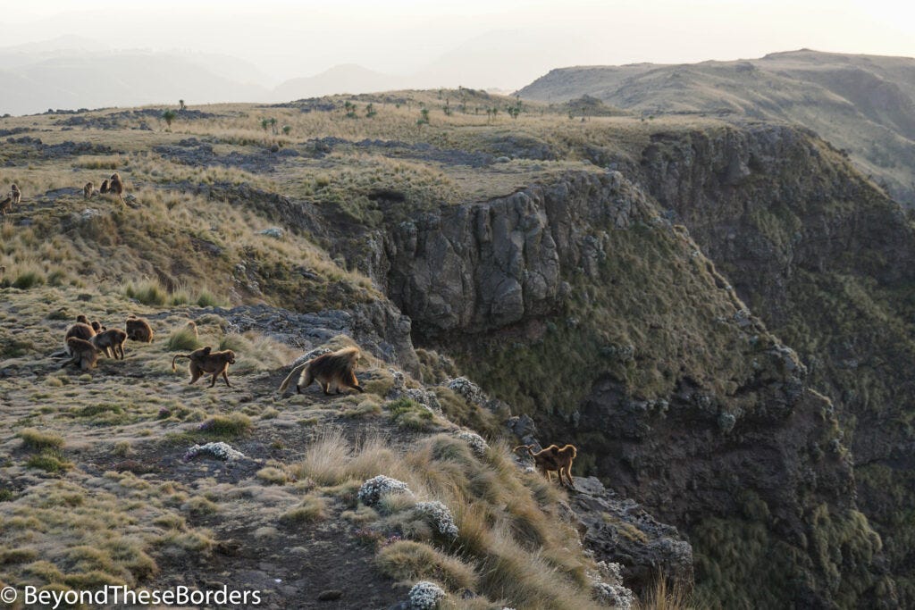 On day two, the group split up as the majority of people only had a two day trip. Four of us, plus our guide, continued over a dry hilly landscape with light blue, yellow, purple and orange on the ground. Then finding some more mountain views, we saw an walia ibex on a plateau far below. OK… so I wouldn’t have been able to tell it was an ibex since it was SO far away. It was not much more than dot, but we still did find one. For sunset we settled near a cliff, took in the amazing landscape, and watched 50+ gelada monkeys grazing. As the sun disappeared, the geladas went flying over the edge to their sleeping quarters in the cliff walls below. Joining a few other hikers, we camped overnight at a very basic structure (some camping in tents, and others on cots inside a drafty old building).