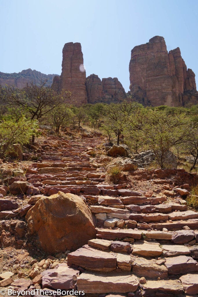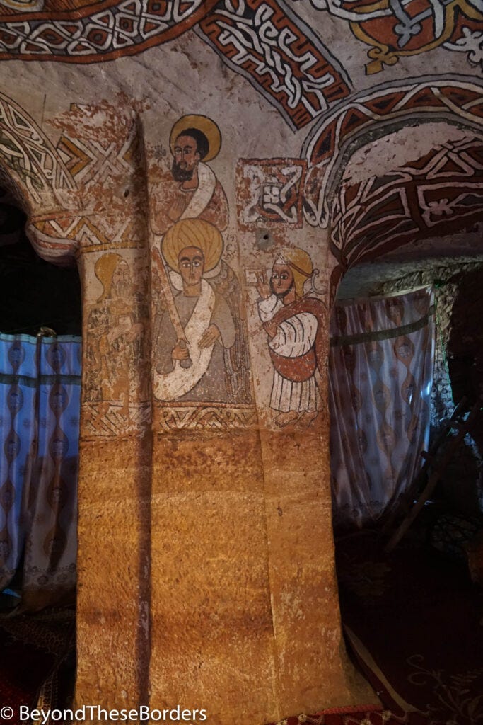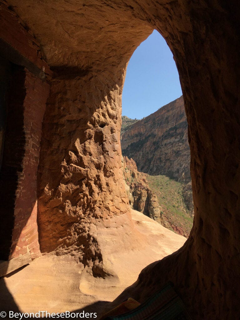 Next up, my first rock-climbing experience. I had no idea I would be rock-climbing until it began! I got to scale up to the towering Abuna Yemata Guh (a cave church in the Tigray region). It is one of many rock-hewn churches the Tigray region is famous for. These churches are carved from cliff faces, often using a pre-existing cave as its base. To reach the Abuna Yemata Guh, you must take off your shoes and climb up the steep pinnacle with hand and footholds in the rock. There are locals at the base offering to help you successfully make the journey for a tip.