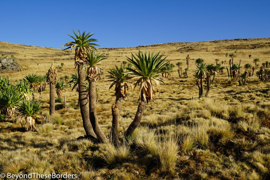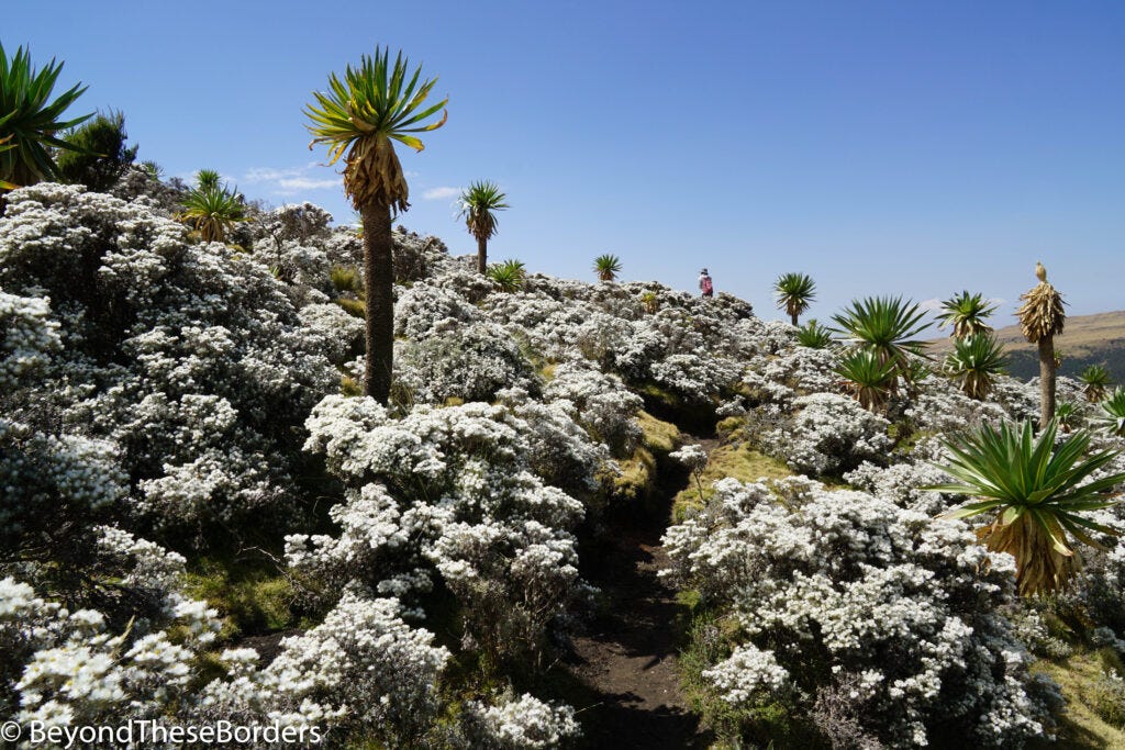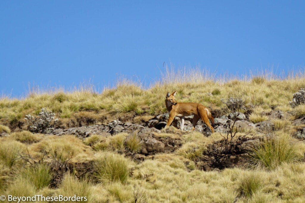 The morning on day three, we woke up to frost covering the ground. The frozen grass crunched under our feet as we set out. We lucked out and spotted the Ethiopian wolf and it was even close enough to get a good view and some photos! More gorgeous mountain views were in store but we also hiked through a lush green forrest.