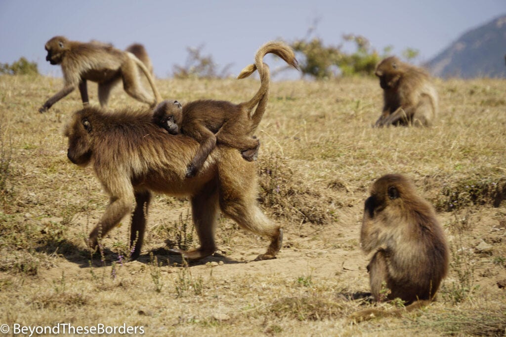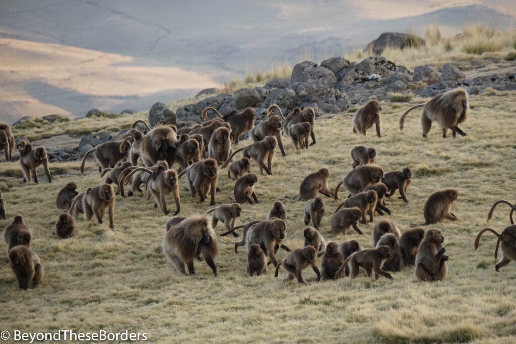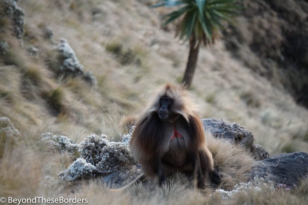 Leaving Gondor, I headed out for 3 days of hiking in the Simien Mountains with a tour group. Near our starting point we spotted a troupe of 30-40 Gelada monkeys near the road. They seemed oblivious to us walking over and snapping tons of pictures. These Ethiopian highlands old world monkeys have shaggy straw/brown hair over their heads and shoulders helping them blend into the long grass, which is 90% of their diet. Sitting back and gazing out, they present the red hourglass patch of skin on their chests.
