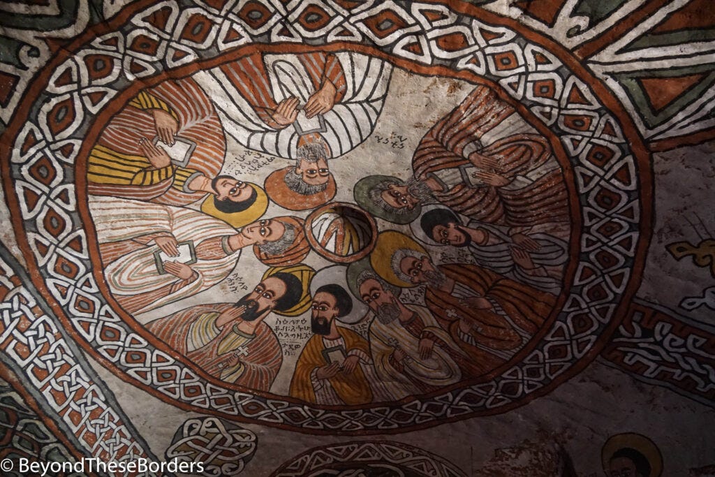 Safely inside, the ceiling and walls are covered in paintings from the 7th century. Part of the ceiling features an image of 9 of the 12 apostles. The man inside also showed me some pages from an old orthodox bible with vibrant pictures painted on pages made from goatskin.