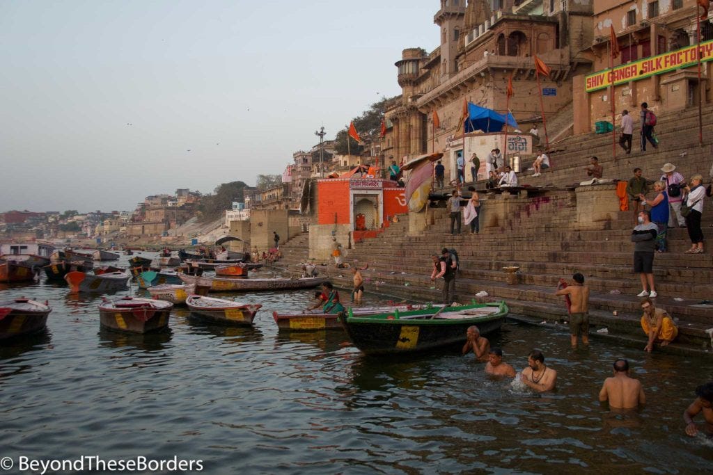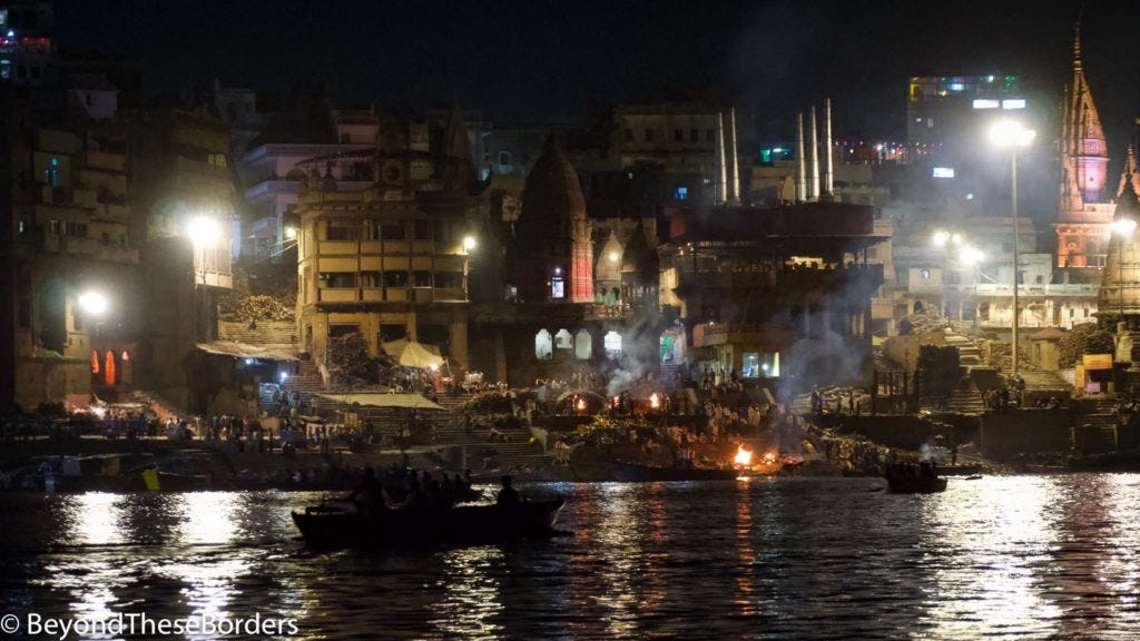 We boarded a row boat and saw bathers, people washing their clothes in the river, and a few more cremations.