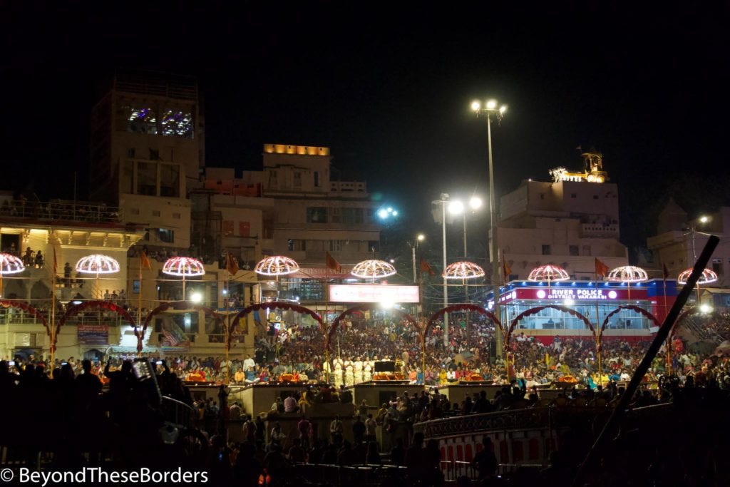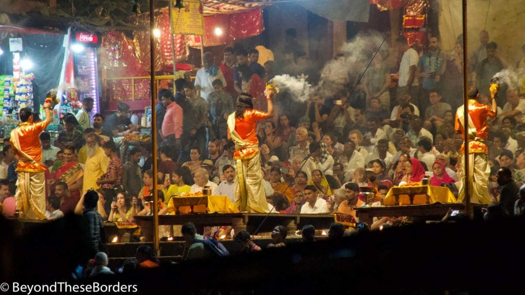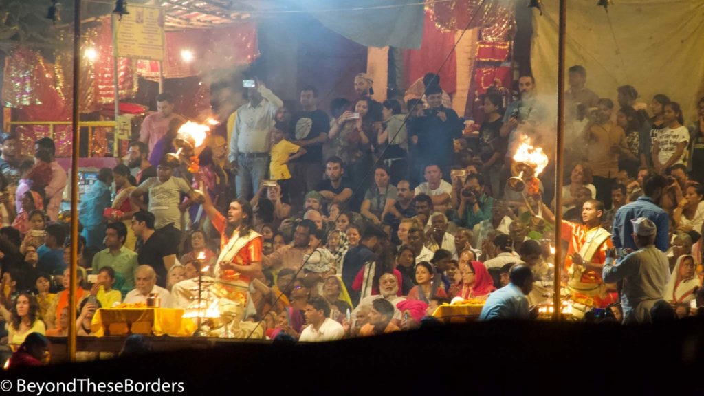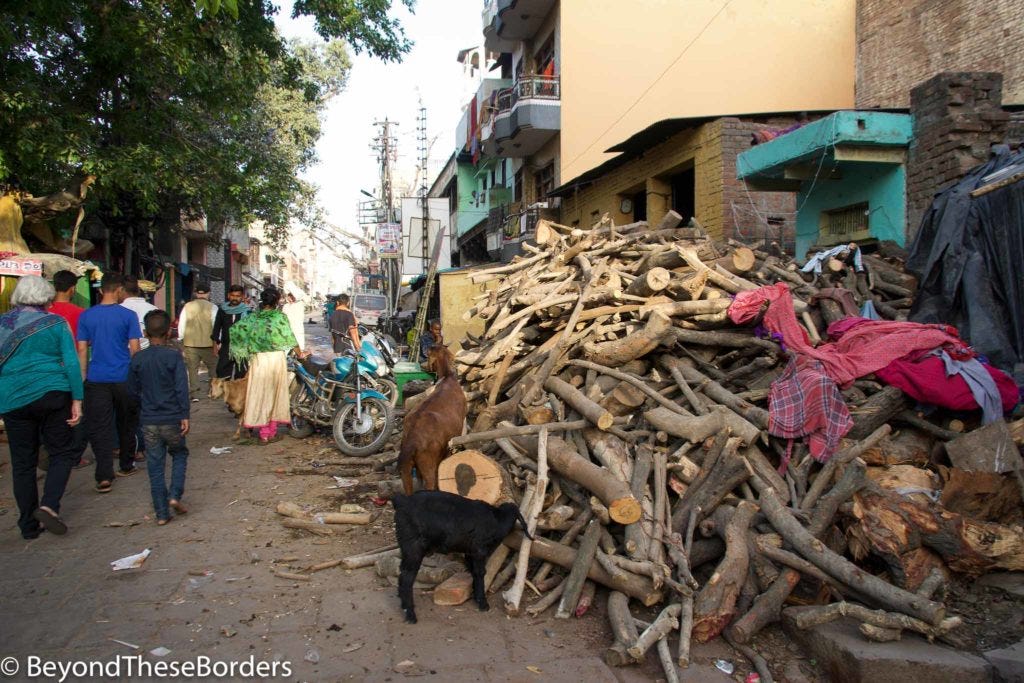 We approached one of the cremation areas and observed fires burning with families surrounding them. We were informed that at cremations, the husband or oldest son is to light the flame. Before the fire is built, the body is carried down and bathed in the Ganges. It’s then dried on the banks, after which the fire is built with wood purchased nearby. No women are at cremations because they are thought to be more emotional and crying out loud is not allowed as it may stop the soul from releasing from the body. I saw a body covered in a blanket being carried to the river on a platform, submerged in the water, and carried back up.