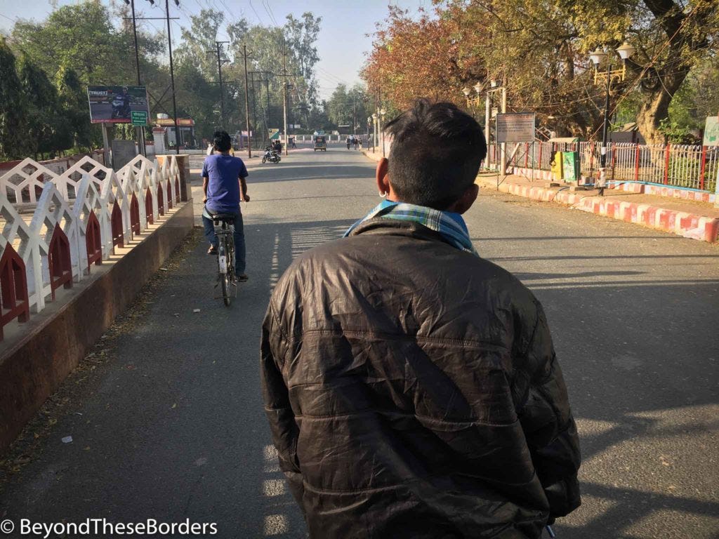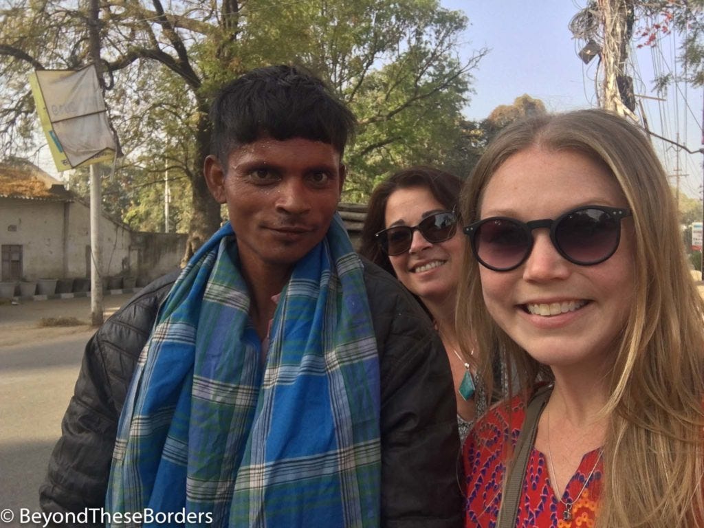 Also eating at that stall was a bicycle rickshaw driver. He was a young, thin man whose face was still stained red from celebrating Holi and had glitter stuck in his hair. He spoke limited English but another moto-rickshaw driver did a little interpreting for us and said to pay whatever we wanted at the end. We chose to have the young man ride us around the neighborhood for 20 or so minutes. We barely got our butts into his too small carriage and he worked hard to get us around. The bike creaked and his bike seat seemed to barely exist anymore. He was very happy to point out places as he pedaled and took a picture with us at the end. We gave him 200 rupees at the end (much more than is probably expected, but we wanted him to have it).