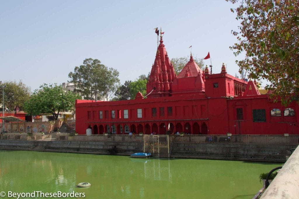 We headed back into Varanasi where the group visited a silk company; but we left the group to explore. We grabbed a moto-rickshaw to Durga Temple. It’s a deep red temple and no photography was allowed inside. We walked into the entrance to a man drumming in the corner. We left our shoes next to a wall and entered the main temple. We sat to the side and watched as people entered, rang the loud metal bell above them, and walked up to the Brahmin priest in the center who was taking offerings and giving blessings. One family came in with a goat who seemed very concerned about being there. We wondered if it was being offered, but they left with the goat again, now with flowers around it’s neck. So I guess the goat was there to be blessed. Around the temple were other bells that were intermittently banged by people. It was very loud inside.