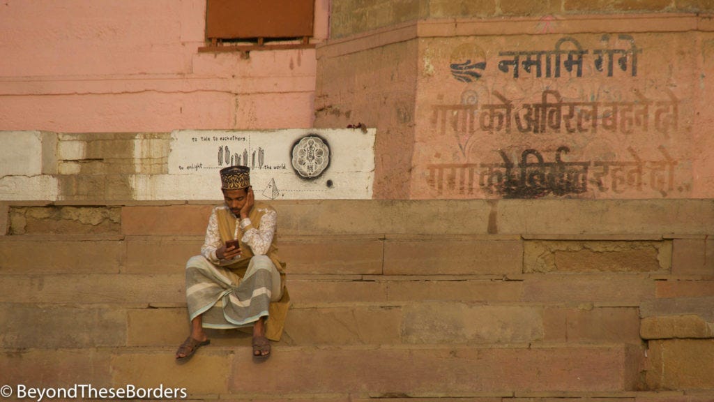 Our first morning in Varanasi, my friend Angie and I ventured out on our own away from the tour group. We decided to set out in search of street food for breakfast. It only took crossing the street from our hotel to find a little stall set up frying breads and serving hot Indian veggies. Multiple locals were eating here, so we decided to try it out. We spent a total of 50 rupees (around 70 cents USD) which paid for unlimited veggies and bread for both of us. The cook kept asking if we wanted more, we would say “no”, and yet more was served to us. We found the only way to stop the food coming was to not finish what was in front of us.